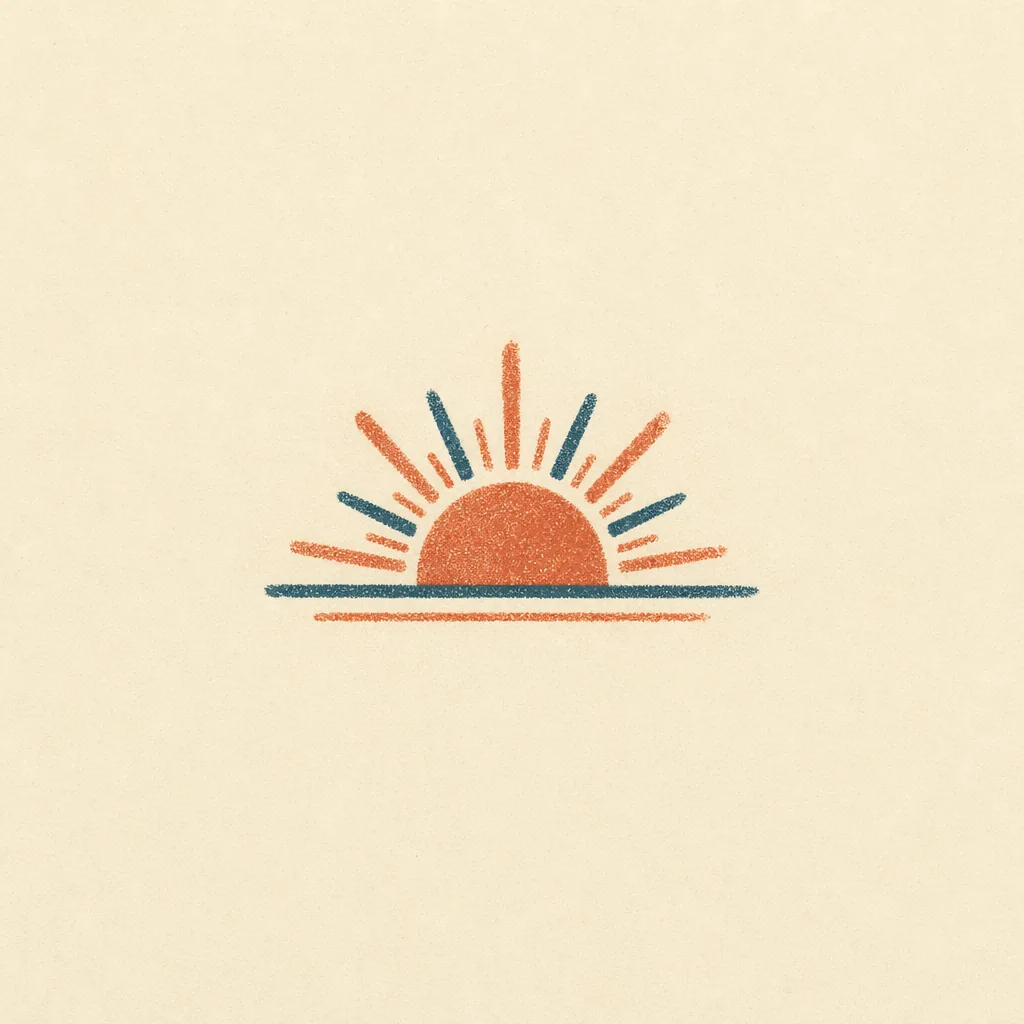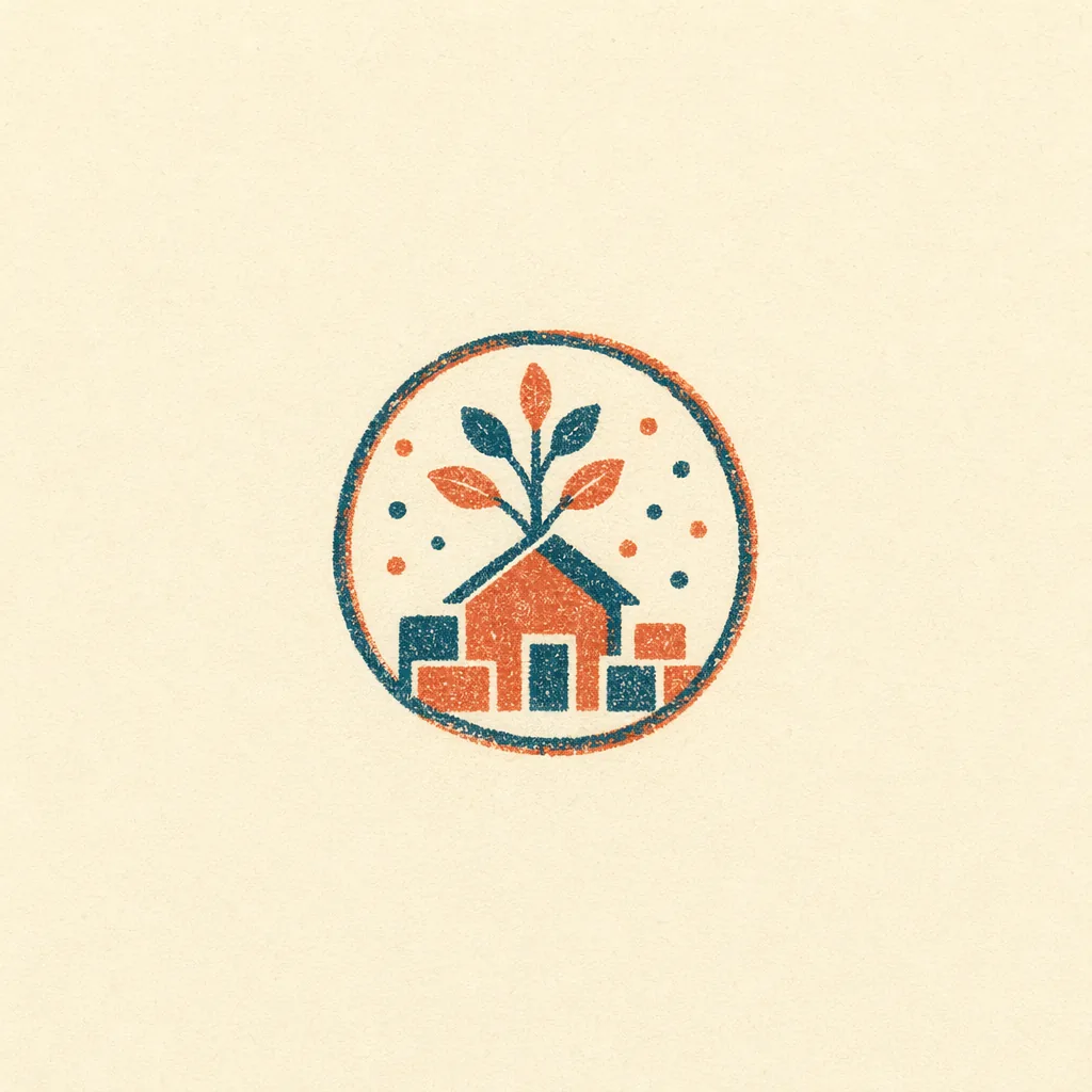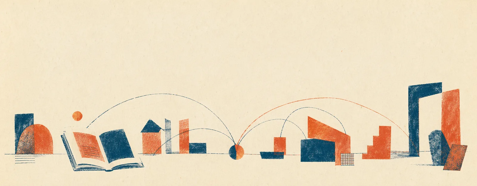Risograph 双色叠印插图:在深蓝纸底上以暖橙叠印出阶梯、网格与圆形,抽象表达基础设施层叠的意象